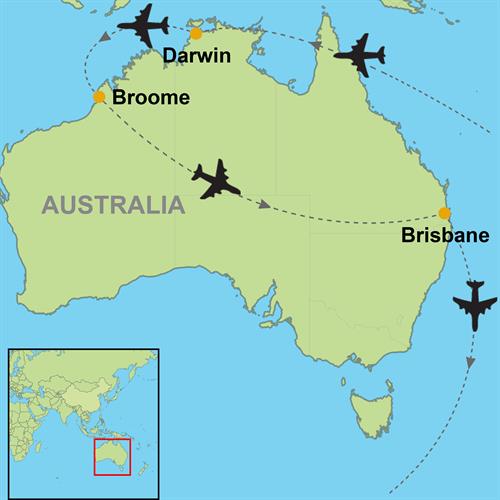 Combine Darwin (this modern capital city is the perfect getaway for visitors looking for tropical paradise. it’s amazing waterfront area allows visitors to enjoy several beaches and green areas, it is also the gateway to World Heritage-listed Kakadu National Park), Brome (a beach resort town in western Australia’s Kimberley region. Along its Indian Ocean coastline, the white sands Cable Beach offer a dramatic backdrop for sunset camel rides) and Brisbane (explore the vibrant urban villages across this gorgeous place) with flights between cities.