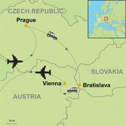 Trip to the heart of Central Europe, linking three magnificent capitals in Czech Republic, Slovakia and Austria. With the unparalleled comfort of your own Chauffeured Private Service, enjoy the Golden City of Prague (architecture, towering churches, old bridges and romantic alleys), Bratislava (charming and compact Slovak capital, strategically positioned on the Danube River) and imperial Vienna (waltzes, grand palaces, stylish cafes and Mozart); including captivating stops at Brno (modern architecture, imposing medieval fortress, and its status as a dynamic cultural and academic hub in the heart of Moravia) and the ancient Carnuntum (a fully reconstructed Roman military city).