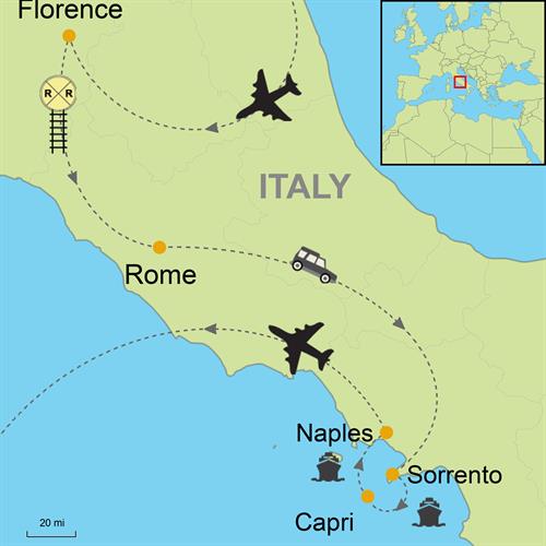 An unforgettable journey along Italy. Start in Florence (home to Renaissance art and architecture) and after that, take a train to Rome (the Eternal City, with its stunning architecture and delicious food). Continue south by transfer to visit Sorrento (overlooking the Bay of Naples, this coastal town is famous for its Limoncello liquor and good base for visiting the ancient sites of Pompeii and Herculaneum). From there connect these destinations with Ferries/hydrofoils, first to Capri (known for its magnificent rock formations and the beauty of the natural surroundings) and finally, to Naples (situated near Vesuvius, charming city with its narrow streets, ancient churches, street markets, bars and restaurants).