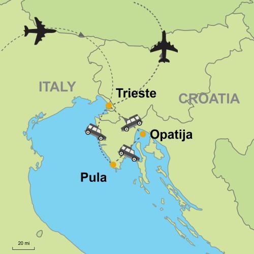 Italian Border to the ancient wonders of Croatian Dalmatia!. Begin in the elegant Italian port city of Trieste (maritime gateway for northern Italy, Germany, Austria and Central Europe) then take a transfer to Pula (a seafront city on the tip of Croatia’s Istrian Peninsula. It is known for its protected harbor, beach-lined coast and Roman ruins) with stops in Motovun and Piran.then After tha visit Opatija (birthplace of Croatian tourism and historic seaside resort of The Kvarner Riviera) with a stop in Rovinj. Last but not least go back to Trieste with stops in Skocjan Caves and Lipica Stud (Horse) Farm.