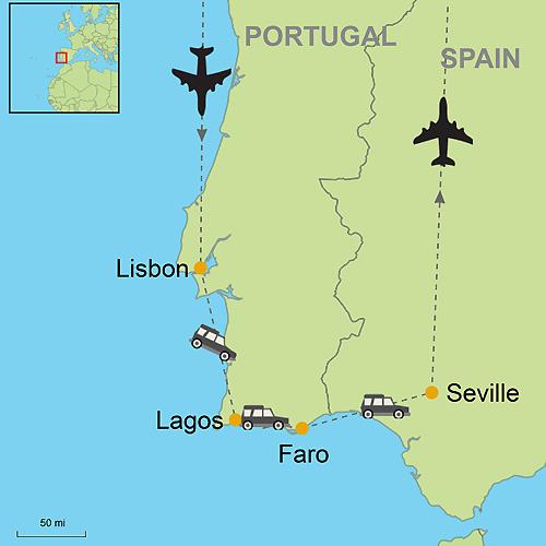 Unforgettable vacation through Portugal and Spain!. Explore Lisbon (the capital of Portugal; full of medieval charm and modern sensibilities), after that, travel to Lagos (famous for its stunning beaches with beautiful rocky formations and steep cliffs) and, then to Faro (the best-known city in Portugal's deservedly famous Algarve Region). Finally, visit Seville (known for its fragrant orange blossoms and the passion of Flamenco and amazing buildings). Travel between cities by door-to-door service, with stops at Alcacer do Sol, Church of Sao Lourenco de Almancil and Huelva.