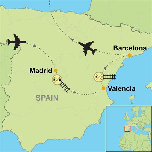 Enjoy an unforgettable Spanish trip! Discover Madrid (a vibrant city with diverse culture, excellent museums, and incredible food), Valencia (the gateway to the Mediterranean; coastal mountain ranges and sandy beaches complement the history and modernism of this stunning city), and Barcelona (the architecture of Gaudi dominates the city contributing to its eccentric yet elegant energy) with guided city tours which introduce you to main atractions, neighborhoods, museums and much more... Conected by comfortable and convenient train rides.