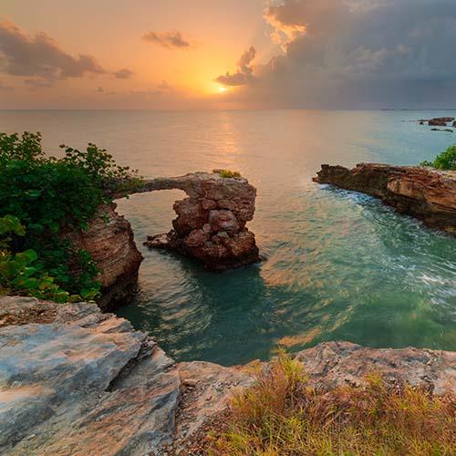 See El Puente Natural, Cabo Rojo’s famous natural stone bridge that has become one of the most photographed spots in Puerto Rico, frequently appearing on magazine covers. It is part of the Boqueron State Forest which is an easy scenic hike from Los Morrillos Lighthouse.
