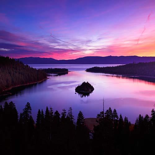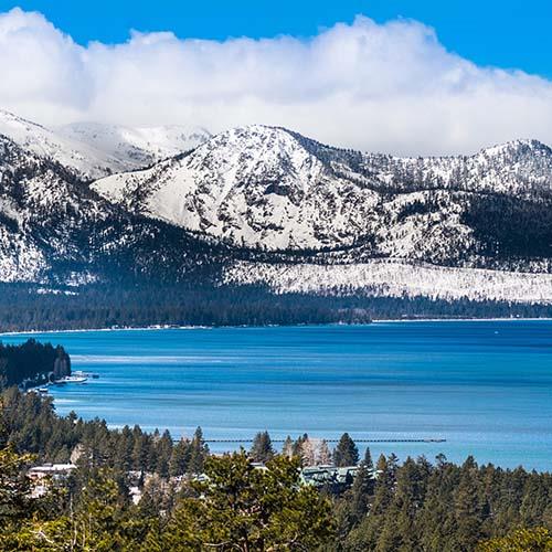 Lake Tahoe is a mesmerizing shimmering topaz lake surrounded by majestic peaks straddling the California-Nevada border in northeastern California. It is the largest alpine lake in the US, measuring 22 miles long, it is the 10th deepest lake in the world, the second deepest in the states, and boasts 72 miles of sparkling shoreline dotted with endless activities and entertainment. Lake Tahoe is one of the purest lakes in the entire world, with 99.99% purity, roughly the same as distilled water. This stunning scenic area is a spectacular sight to take in with the deepest of blue waters, soaring mountains, pine-scented air, a rocky shoreline, and clear blue skies for most of the year, it's an adventurer's dream vacation destination.