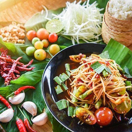 Must Savor Specialties: Phad Thai (stir-fried rice noodles seasoned with fish sauce, lime, red chili pepper, sugar, and tamarind juice, tofu, eggs, dried shrimp, bean sprouts, and meat usually chicken, pork or shrimp), Noodle soup (beef or pork broth, with beef, chicken, pork, or seafood), Som Tam - Gai Yang (green papaya salad with grilled chicken on a skewer with sticky rice), Moo Ping (grilled pork skewers), Khao Niao (sticky rice), Seafood BBQ (prawns, squid, mussels), Kanom jeen (thin spaghetti noodles made from rice with carp, or other fish and dipping sauce), Khao Mok Kai (yellow chicken rice served with fried shallots, sliced cucumber, and a small bowl of clear soup), Khao Man Kai (oiled rice chicken, Hainanese chicken rice), soft shell crab, stir-fries, curries.