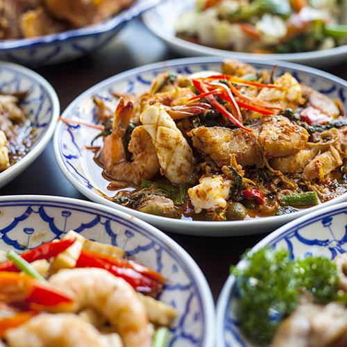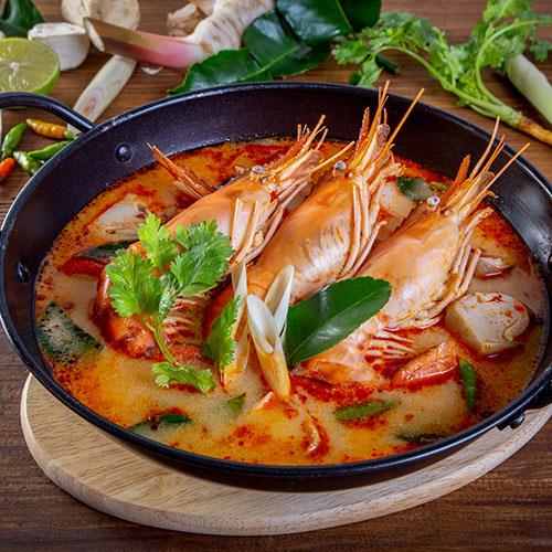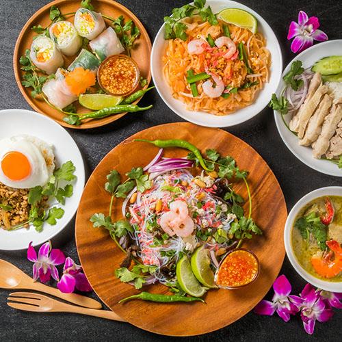 Must Savor Specialties: Tom yum, Sticky rice, fried fish, papaya salads, Thai crepes, coconut ice cream, grilled bananas, classic mango sticky rice, red curry with prawns, chicken cashew nuts, Tom Yam Koong, chocolate lava cake, Thai Ice Tea, Matcha Tea, White Tea, barbecued seafood, dim sum, satay, pad Thai, barbecue spears, different variations of chicken, fried rice, noodles, soups, crispy duck, curries.