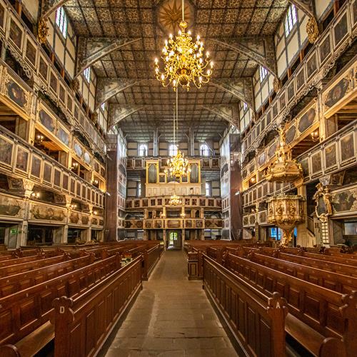 The Churches of Peace in Jawor and Swidnica are the largest timber-framed religious buildings in Europe. The churches were built in the former Silesia in the mid-17th century, a symbol of religious tolerance amid the religious strife that followed the Peace of Westphalia of 1648. After the Peace of Westphalia, the Protestants in Silesia were allowed by the Habsburg Roman Catholic emperor to build three churches, the only restrictions were that they had to be constructed outside the city walls, made of wood or clay, and built in less than a year. Albrecht von Sabisch is the architect of these churches, he designed these wooden buildings that had never been seen before in complexity and size, they had to be big enough to be a true place of refuge for the Protestant population. The church in Glogow burned down in 1758, and Jawor and Swidnica were restored by Polish-German cooperation. The interiors of these churches are ornately decorated with Baroque-style architecture. The interior of the Jawor church is decorated with 180 paintings, depicting Biblical scenes from teh Old and New Testament. The church in Swidnica features apocalyptic visions as well as the panorama of the surrounding area. The churches were added to the UNESCO World Heritage Site list in 2001.
