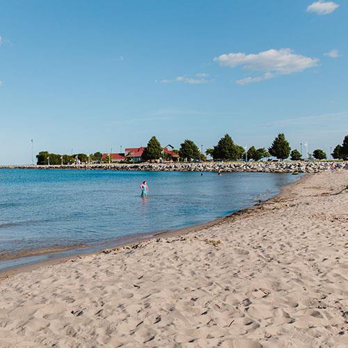 The Lake Michigan shoreline north of Milwaukee and south of Door County is very diverse geographically, ranging from cities and towns to beaches, state parks, nature preserves, and windswept golf courses. The largest city along the coast in this area is Sheboygan, where the Sheboygan River flows into Lake Michigan. Other towns and cities on the coast include Manitowoc and Two Rivers north of Sheboygan and Port Washington and Grafton south of Sheboygan.