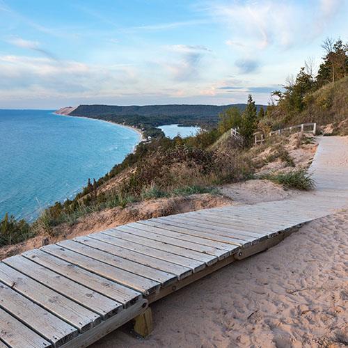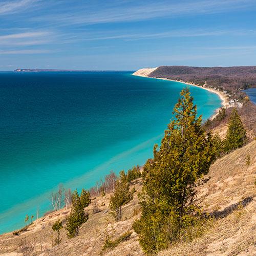 Pierce Stocking Scenic Drive is a 7.5-mile drive that leads travelers through verdant forested landscapes and along the famous sand dunes to various overlook points. The Lake Michigan Overlook is one of the most stunning on the drive, with an unforgettable, unmatched iconic view. There are tours available, and trails for hiking, biking, and snowshoes in the winter. On the scenic drive, there are over 100 miles of trails that range from easy to difficult, the Empire Bluff trail is a 1.5-mile round trip hike that leads hikers to the very edge of the dunes. The infamous Dune Climb is a strenuous hike, the Pyramid Point Trail is more moderate with hills, and the 9-mile Alligator Hill trail takes hikers away from the dunes and higher up to provide spectacular views of the lake and forests.