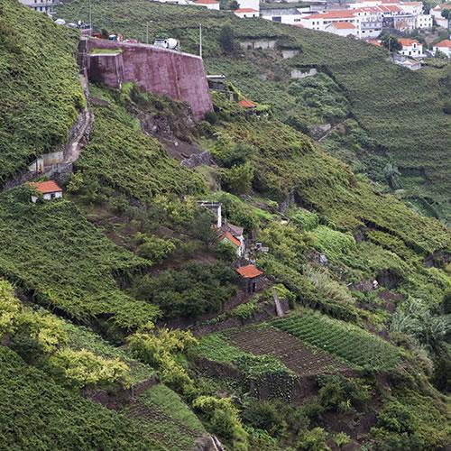 Madeira gives its name to one of the world’s great fortified wines, and both the wine and the island hold unique places in the history of winemaking. All of the fortified wine that comes from the island is now produced under the Madeira DOC, with table wines sold under the VR (Vinho Regional) title Terras Madeirenses. The microclimates in the region vary with some drier areas and other more humid areas, Madeira boasts mild temperatures and ocean winds. The relief on the island is very irregular, so vineyards here must be terraced in “poios” to grow along the mountainous slopes and deep valleys. The soils are volcanic and very fertile.